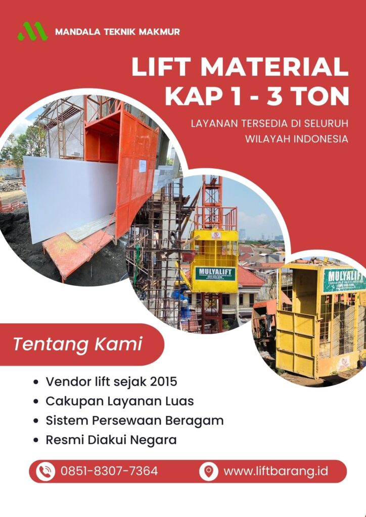 Mandala Teknik Makmur adalah perusahaan penyedia Lift Barang 1 – 3 Ton dan berbagai alat-alat proyek konstruksi yang terpercaya sejak 2015, dengan berbagai pengalaman dari proyek BUMN maupun Swasta kami siap mendukung berbagai kebutuhan proyek anda mulai dari skala kecil hinnga besar.