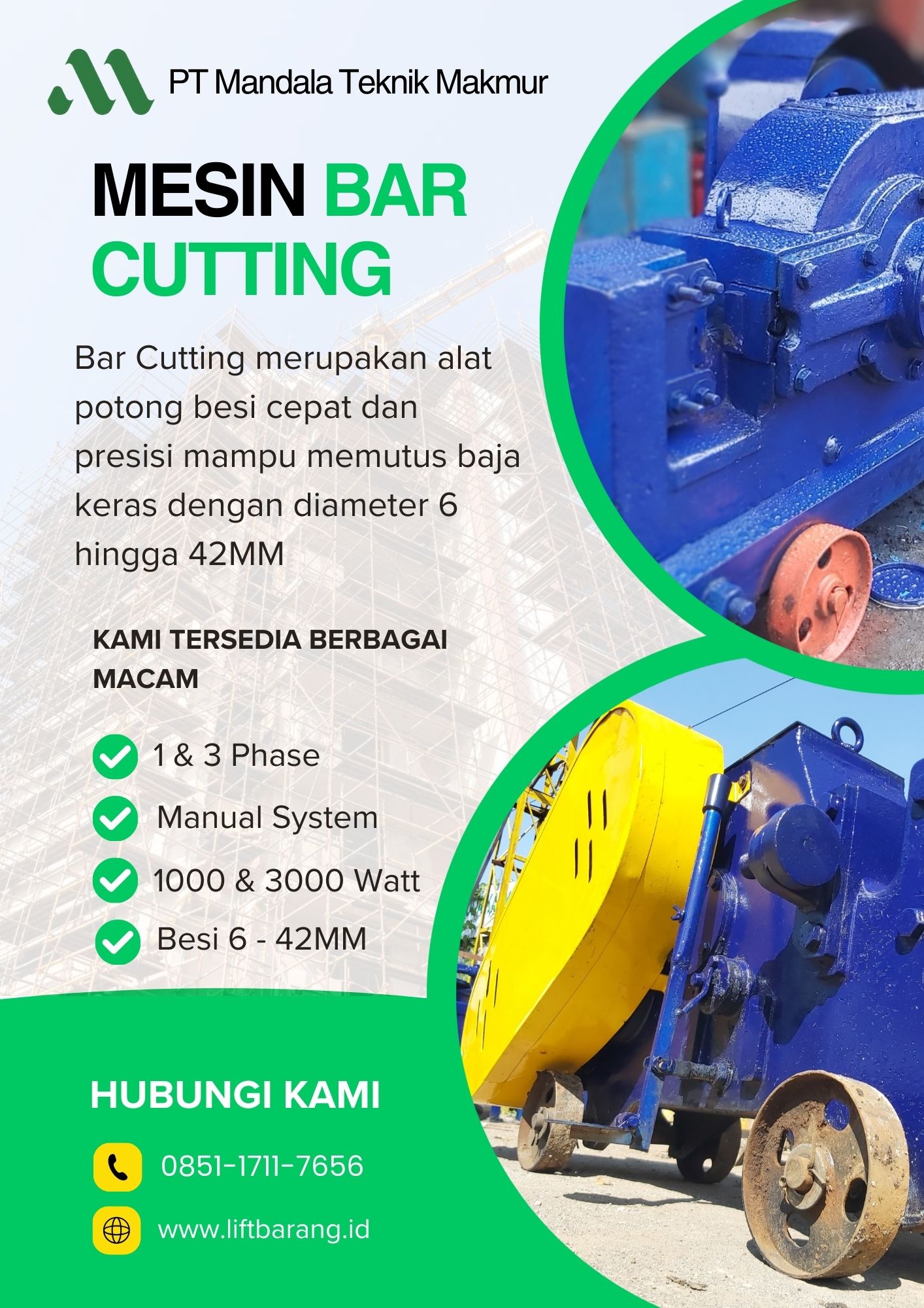 Mandala Teknik Makmur adalah perusahaan penyedia Sewa Mini Crane, Lift Barang, Bar Bender dan berbagai alat-alat proyek konstruksi yang terpercaya sejak 2015, dengan berbagai pengalaman dari proyek BUMN maupun Swasta kami siap mendukung berbagai kebutuhan proyek anda mulai dari skala kecil hinnga besar.