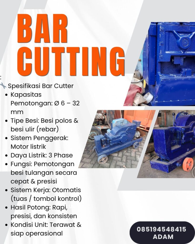 Kenapa banyak kontraktor memilih Sewa bar cutter kami? Karena unit kami dibekali mata pisau berkualitas tinggi yang sanggup memotong besi mulai dari diameter 10mm hingga 36mm tanpa kendala. Hasil potongannya sangat presisi, sehingga meminimalkan waste atau sisa besi yang terbuang sia-sia di lokasi proyek.