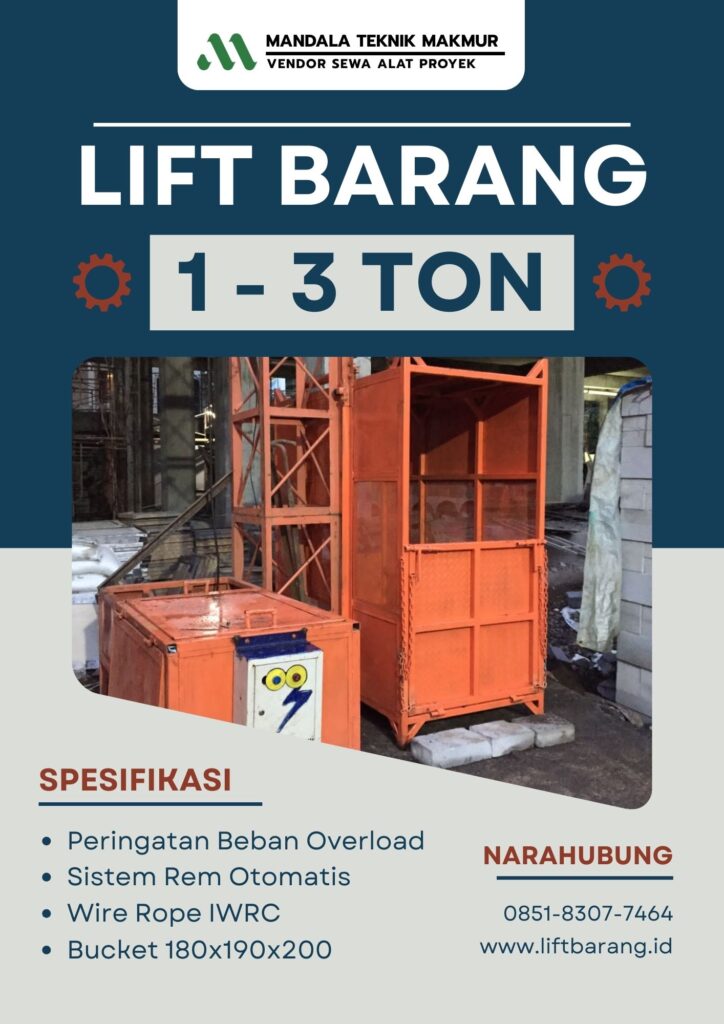 Menggunakan Menyewakan Lift Barang Proyek 1 – 2 Ton PT Mandala Teknik Makmur (MTM) merupakan pilihan pas bagi Anda yang memerlukan proses pengangkutan vertikal dengan standar kecepatan, akurasi, dan keamanan yang tinggi. Adanya alat angkut vertikal ini memegang peranan vital dalam memastikan kecepatan pemindahan material-material ke lantai atas.