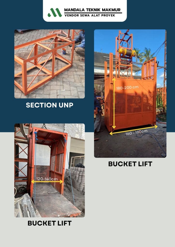 Kelengkapan Unit: Kami menyediakan lift barang kapasitas 1 – 3 ton dengan pilihan single atau double cabin. Selain itu kami juga menyediakan alat-alat proyek lain seperti bar cutter, bar roller, lift passenger 2 ton, hoist lift, bucket cor dan genset 80kva.