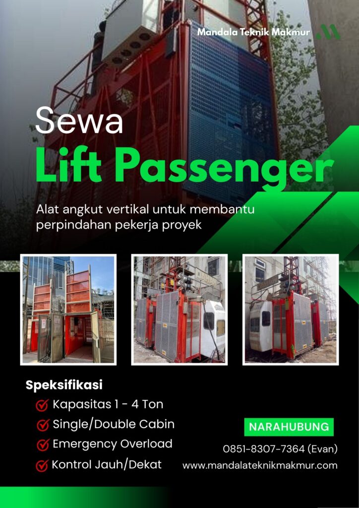 Menggunakan Tempat Sewa Lift Orang/Passenger PT Mandala Teknik Makmur (MTM) merupakan pilihan pas bagi Anda yang memerlukan alat untuk proses perpindahan para pekerja proyek ke ketinggian bagunan tertentu, dengan tentu mengutamakan keselamatan dan keamanan, Adanya alat Lift Orang/Passenger ini memegang peranan vital dalam menentukan keamanan perpindahan para pekerja proyek.