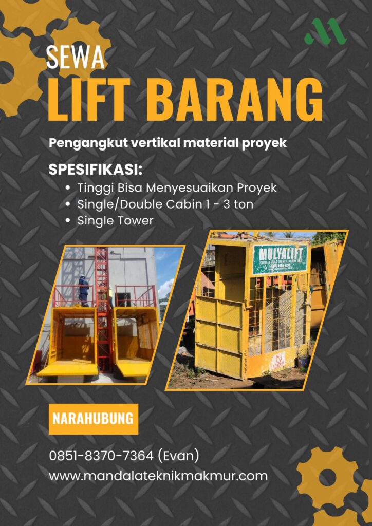 Mandala Teknik Makmur adalah perusahaan penyedia Lift Barang 1 – 3 Ton dan berbagai alat-alat proyek konstruksi yang terpercaya sejak 2015, dengan berbagai pengalaman dari proyek BUMN maupun Swasta kami siap mendukung berbagai kebutuhan proyek anda mulai dari skala kecil hinnga besar.